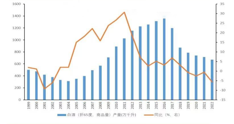 隨著我國居民收入水平的持續提升,白酒產量卻連續五年呈現下降趨勢,酒類消費的主導力量逐步從政務消費向商務消費、大眾消費轉型。目前,白酒行業面臨“由量到質”的消費轉變,“喝少點、喝好點”成為主流消費心理。加之,2022年6月執行的白酒新國標,促進了消費者對于高品質白酒的追求。